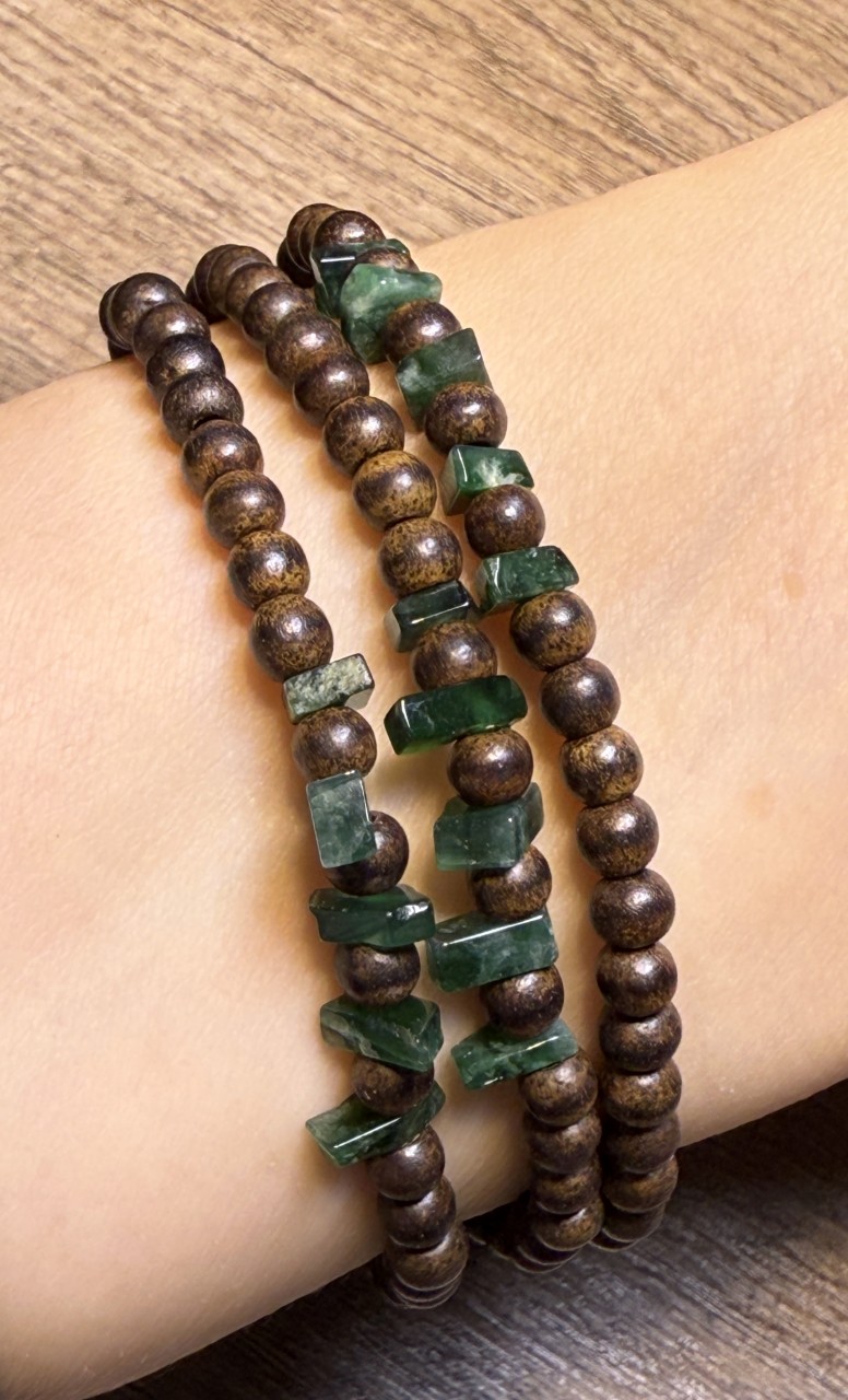 不規則切割翡翠,製造層次感,配上4.6mm嘉里曼丹沉香三圈,