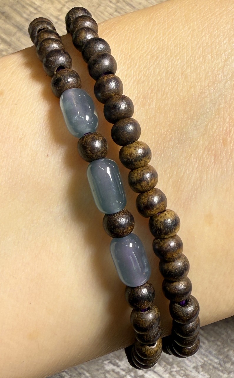 3粒半圓形藍翡翠配5+加里曼丹沉香雙圈