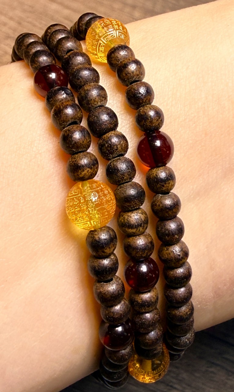 3粒7.4mm心經蜜蠟襯6粒5.6mm琥珀配4.6mm加里曼丹沉香三圈