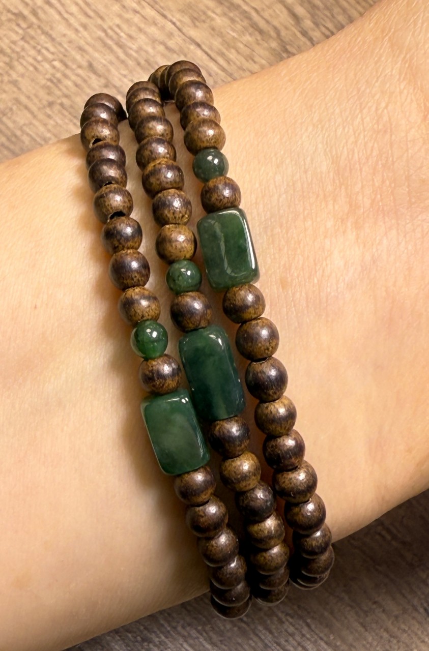 方形綠色翡翠襯上圓珠翡翠配4.6mm加里曼丹沉香三圈