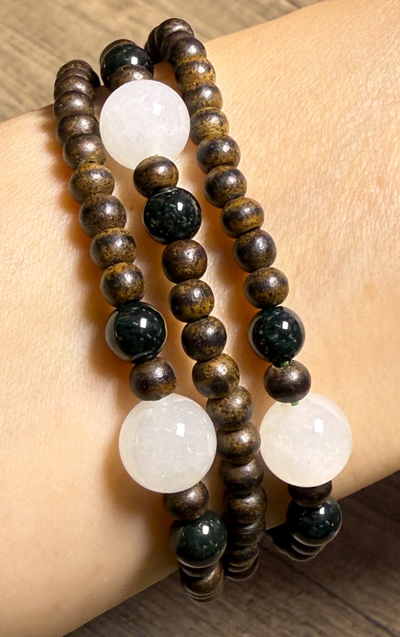 3粒9.6m白翡翠襯6粒6+墨翠配4.6mm加里曼丹沉香三圈