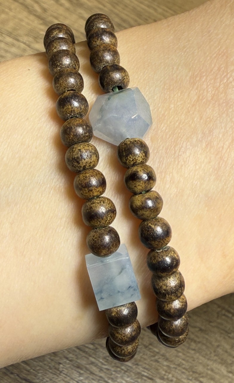1粒立體飄花,1粒方形飄花翡翠配5.6mm加里曼丹沉香雙圈