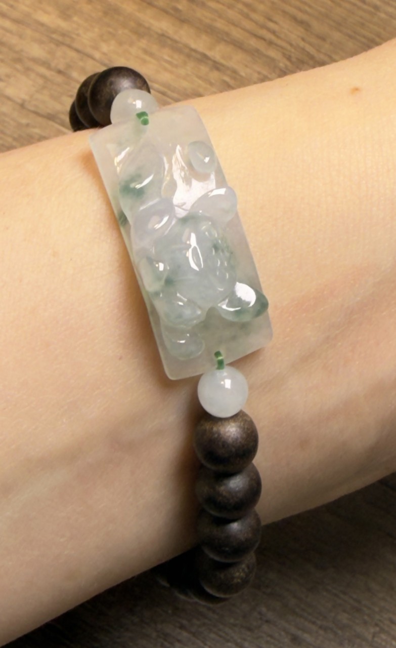 雕蓮花飄花手牌襯兩粒5+白翡翠配7+加里曼丹沉香