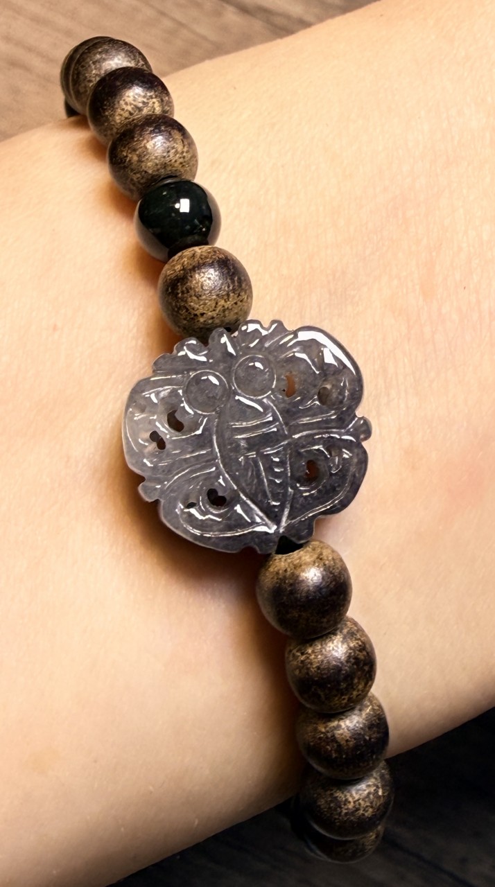 雙面雕蝴蝶造型墨玉襯1粒6mm墨翠配6.6mm加里曼丹沉香