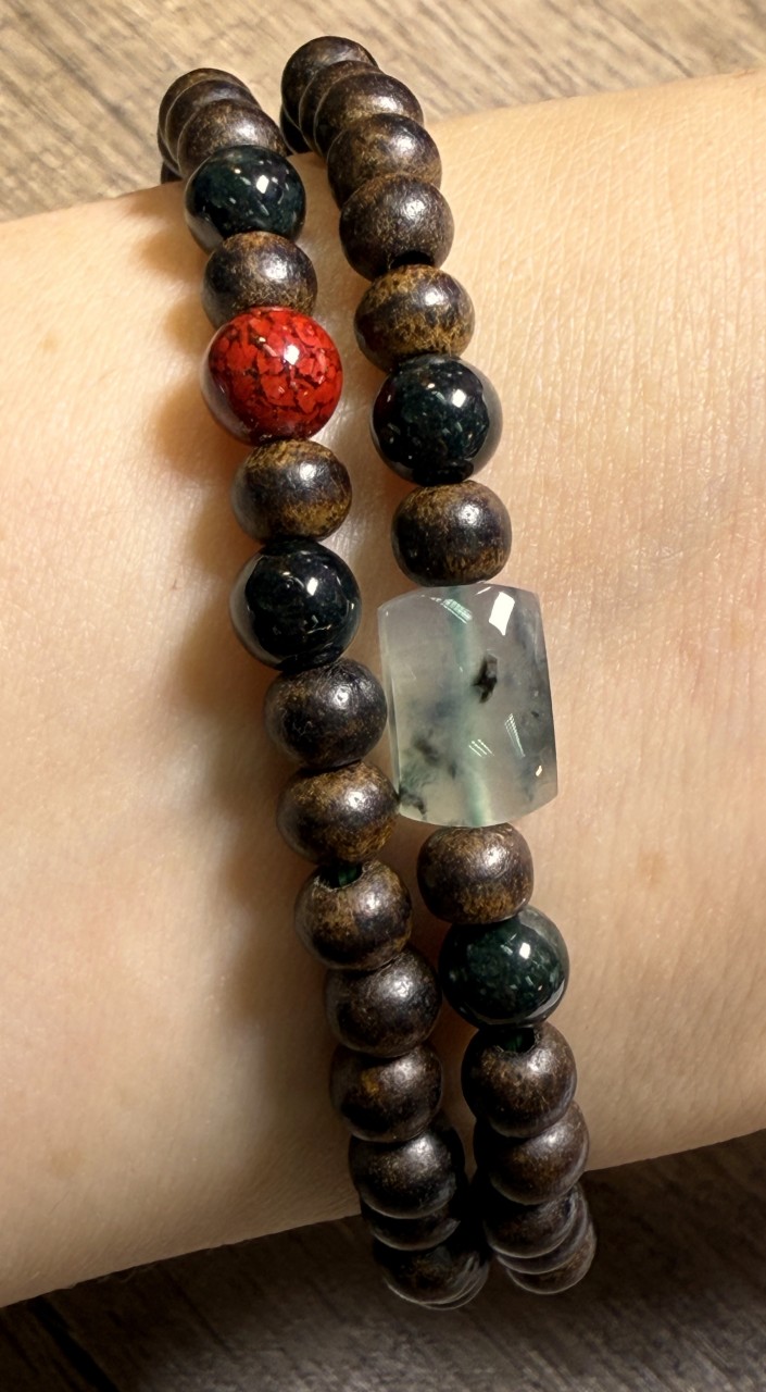 飄花方形翡翠襯3粒6mm墨翠,1粒6.5mm原礦硃砂,配5.6mm加里曼丹沉香雙圈